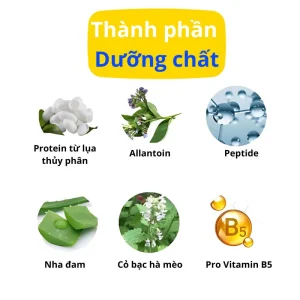 - Protein từ lụa thủy phân, Allantoin – chiết xuất từ rễ cây Comfrey, Peptide, Chiết xuất nha đam, Chiết xuất cỏ bạc hà mèo, Pro Vitamin B5
