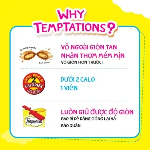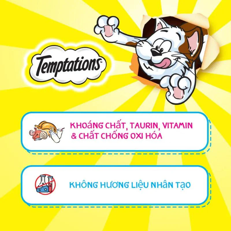 - Bánh thưởng cho mèo Temptations đến từ Mỹ với 100% dinh dưỡng cho mèo trưởng thành. Đây là dòng bánh thưởng ít calo, có vỏ ngoài ròn tan, bên trong mềm và sệt sẽ khiến mèo rất thích thú. Bánh thưởng Temptations có 3 vị: Gà, cá ngừ và hải sản sẽ giúp thúc đẩy vị giác của mèo, làm chúng thấy ngon miệng và thích ăn. Sẽ thật tuyệt khi chơi đùa, mèo được thưởng một viên bánh thưởng ngon lành bổ dưỡng.