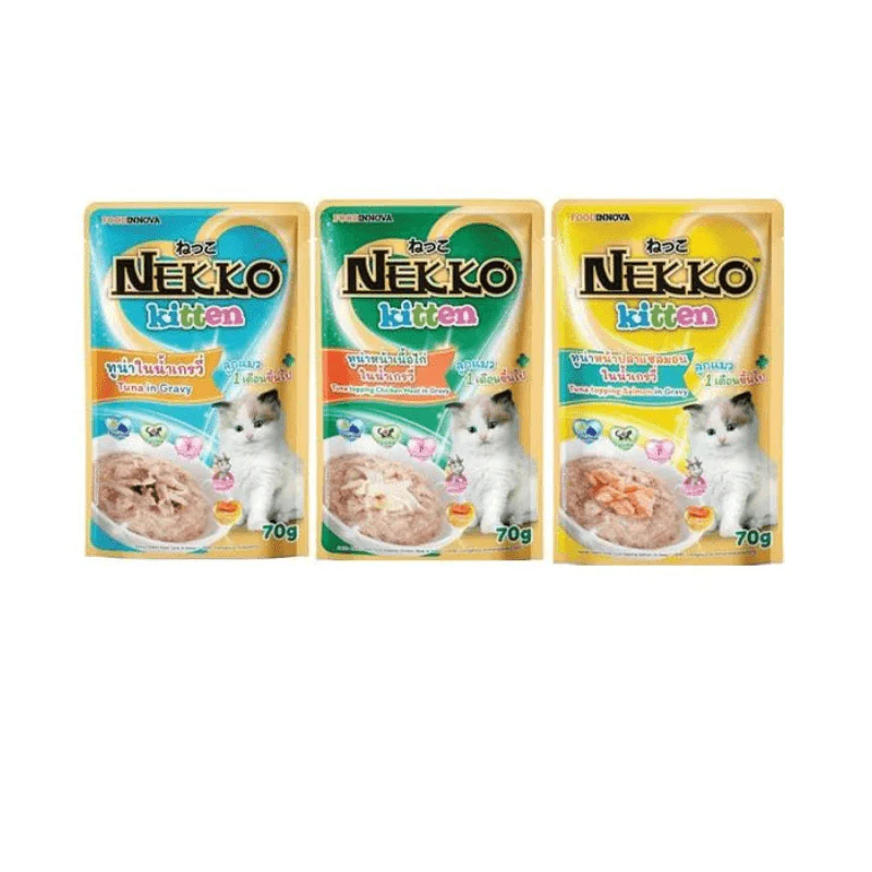 Pate Nekko cho mèo con được làm từ 100% thực thịt và cá thật, chất lượng cao và đã được lựa chọn là tốt. Những chú mèo rất thích hương vị của cá, thịt và phô mai trong các loại pate Nekko. Sản phẩm chứa các vitamin và khoáng chất cần thiết cho con mèo yêu quý của bạn.