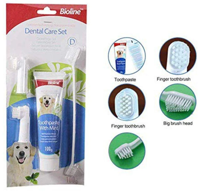 - Set Kem Đánh Răng Cho Chó Kèm Bàn Chải Bioline là sản phẩm vệ sinh răng miệng cho chó được nhiều khách hàng yêu thích lựa chọn. Sản phẩm gồm 1 tuýp kem đánh răng 100g và 1 bàn chải đánh răng 2 đầu. Bàn chải Bioline có thiết kế nhỏ gọn, phù hợp với kích thước răng miệng của chó. Đầu bàn chải được làm từ sợi lông mềm mại, giúp đánh răng nhẹ nhàng, không gây tổn thương nướu răng.